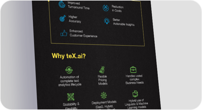 SOLUTION Improved Reduction Turnaround Time in Costs Higher Better Accuracy Actionable Insights Enhanced Customer Experience Why teX.ai? Automation of Flexible Handles varied complete text Pricing complex analytics lifecycle Models Business Needs Scalability & Deployment Models Hybrid use of Flexibility (SaaS, Hybrid, Linguistic & Machine On-Prem, Cloud) Learning models Minimal Faster Infrastructure processing requirements times Copyright © teX.ai
