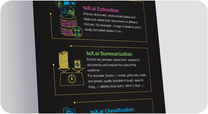 PRODUCT teX.ai Extraction Extract structured, unstructured tables and table look-alikes from documents of different formats. For example - image of tables in pdf to JSON CSV neatly formatted tables in csv. XML XLSX teX.ai Summarization Extract key phrases, topics from reviews & documents and analyze the voice of the customer For example: [topics -> words, price (very costly, low priced), quality (durable in tough, lasts for long,...), delivery (was quick, within 2 days...) teX.ai Classification Identify the category for the text descriptions to classify. For example - Customer type segmentation into irate, satisfied or indifferent. Copyright © teX.ai