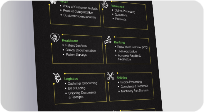 INDUSTRY APPLICATIONS & Retail Insurance • Voice of Customer analysis • Claims Processing • Product Categorization • Quotations • Customer spend analysis • Renewals Healthcare Banking • Patient Services • Know Your Customer (KYC) • Clinical Documentation • Loan Application • Patient Surveys • Accounts Payable & Receivable Logistics Utilities • Customer Onboarding • Invoice Processing • Bill of Lading • Complaints & Feedback • Shipping Documents • Machinery Part Manuals & Receipts ITeS/BPO Manufacturing • Accounting • Sourcing - Purchase • HR & Recruitment Orders, Sales Orders • Travel & Hospitality • Vendor Onboarding • Order Management Copyright © teX.ai