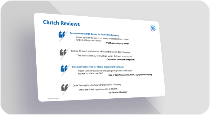 Clutch Reviews Development and QA Service for Real Estate Company “Indium improved the rigor of our testing processes and has resolved hundreds of bugs over the years.” - VP of Engineering, eXp Realty Built an AI based platform for a Renewable Energy Tech Company “They work well with our internal team and are dedicated to our success.” - Co-founder, Renewable Energy Firm Data Analytics Service for Mobile Engagement Company “Indium Software resolved the data aggregation problem, reducing the aggregation time by one-third" - Head of Data Management, Mobile Engagement Company QA & Testing for a Software Development Company "I think one of their biggest strengths is reliability." - QE Director, Bluebeam © Indium Software 10