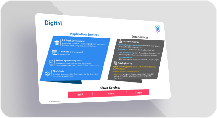 Digital Application Services Data Services Full Stack Development Advanced Analytics Java | Angular JS | React JS | Node JS | MEAN & MERN |Web Services Descriptive Analytics & Visualization using DOMO | R Shiny | Tableau | Databases: MySQL | PostgreSQL | Oracle | SQL Server Qlik | Power BI | SSRS | Pentaho BI | D3 JS Text Analytics - Text Extraction | Summarization | Classification Low Code Development Ai, ML & Deep Learning using R | Python | Alteryx | TensorFlow | Knime Mendix| Claris | Amazon SageMaker | Keras | Azure Machine Learning | Datarama Algorithms Expertise: Mobile App Development Naïve Bayes | Random Forests | Neural Networks | SVM | NLP | Apriori Platforms – iOS- swift | Android - Java, Angular, Kotlin Data Engineering Cross Platform: Flutter| Kony| Netbiscuits| Ionic| Adobe PhoneGap Big Data Consulting | Data Warehouse | Data Migration | Data Lake | Blockchain Data Virtualization Architect | Implement | Optimize | Maintain Blockchain Development | Use-Case Analysis using Hyperledger, Bitcoin Technologies: NiFi | Talend | Pentaho | Hadoop | Spark | MongoDB | Core, Ethereum and R3 Corda Elasticsearch | Redshift | Kafka | Snowflake | SSIS | PostgreSQL | Maria DB AX Cloud Services AWS Azure Google © Indium Software 4