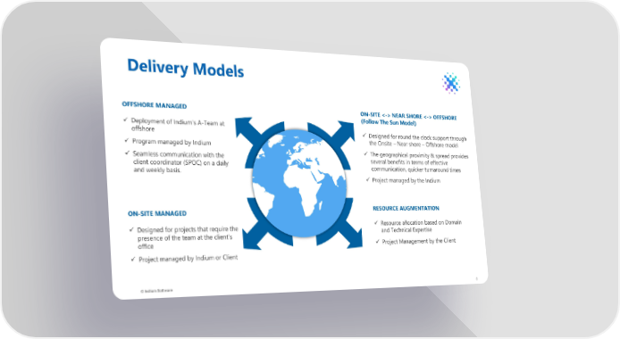 Delivery Models OFFSHORE MANAGED ON-SITE <-> NEAR SHORE <-> OFFSHORE ✓ Deployment of Indium’s A-Team at (Follow The Sun Model) offshore ✓ Designed for round the clock support through ✓ Program managed by Indium the Onsite – Near shore – Offshore model ✓ Seamless communication with the ✓ The geographical proximity & spread provides client coordinator (SPOC) on a daily several benefits in terms of effective and weekly basis. communication, quicker turnaround times ✓ Project managed by the Indium ON-SITE MANAGED RESOURCE AUGMENTATION ✓ Designed for projects that require the ✓ Resource allocation based on Domain and Technical Expertise presence of the team at the client’s office ✓ Project Management by the Client ✓ Project managed by Indium or Client © Indium Software 8